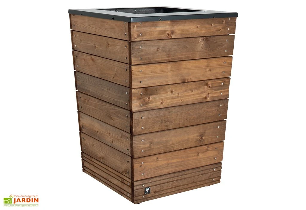 Les dimensions extérieures de la jardinière sont : 0,45 x 0,45 m à sa base et atteint les 0,55 x 0,55 m à son sommet, sur 0,76 m de hauteur. Son bois possède une épaisseur de 1,6 cm. Les dimensions intérieures sont de 0,455 x 0,408 m à la base et 0,508 x 0,508 m en haut, sur 40 cm de hauteur. Cette jardinière vous offre donc une contenance de 90 L. Elle possède 4 montants de 45 x 45 mm, ainsi que des lames de bois de 95 m de long, sur 16 mm d’épaisseur.