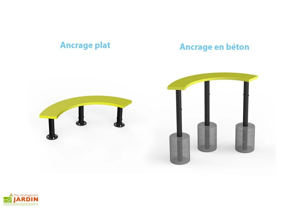 Accessoire idéal pour compléter les jeux pour collectivités de la marque, ce banc devra être fixé au sol à l’aide de l’ancrage fourni. Vous aurez en effet le choix entre deux types d’ancrages : un ancrage plat à visser sur les surfaces dures ou un ancrage pour le bétonnage, recommandé pour les surfaces plus molles comme l’herbe ou le sable, par exemple.