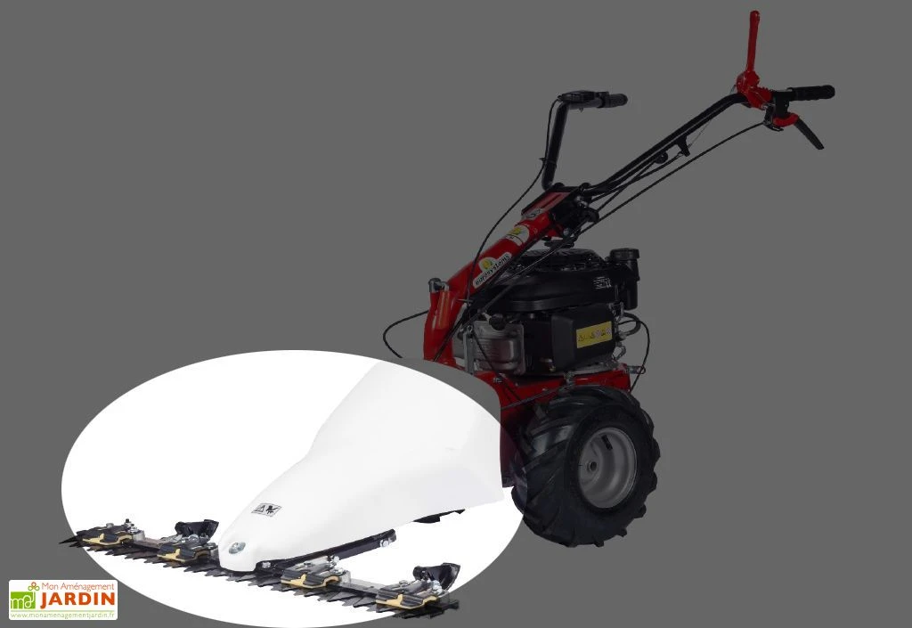 La barre de coupe s’installe sur le porte outils thermique P55 de chez Eurosystems. La barre de coupe bilame mesure 87 cm de largeur et permet de nettoyer parfaitement les terrains peu entretenus. La faucheuse dispose de 2 lames mobiles qui permettent un entretien net. L’accessoire se monte facilement en quelques instants sur le porte outils.