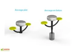 Deux types d’ancrages, pour la fixation du jeu au sol, sont disponibles : un ancrage plat à visser pour surfaces dures ou un ancrage pour le bétonnage, pour les surfaces plus molles type sable ou herbe.