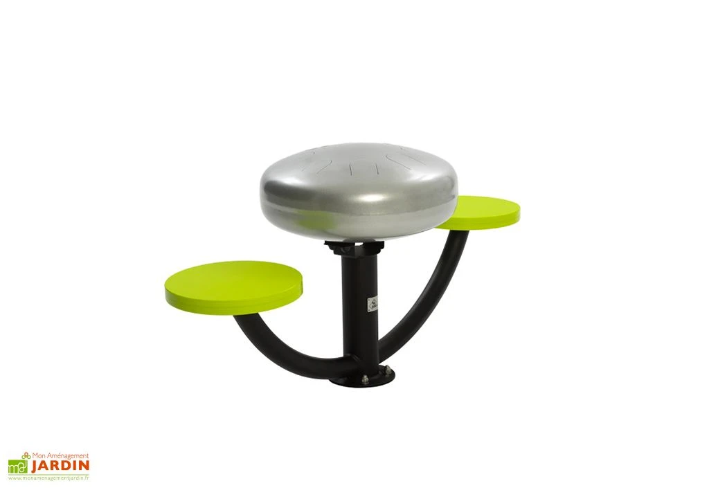 Le handpan est un instrument simple d’utilisation qui consiste en une caisse de résonance métallique que l’enfant viendra frapper à l’aide de ses doigts ou de maillets (disponibles dans les options). Cette caisse de résonance est ici montée sur pied et entourée de deux sièges permettant à deux enfants de jouer simultanément. Le tout mesure 138,5 cm de long pour 71 cm de haut et devra être solidement fixé dans le sol.
