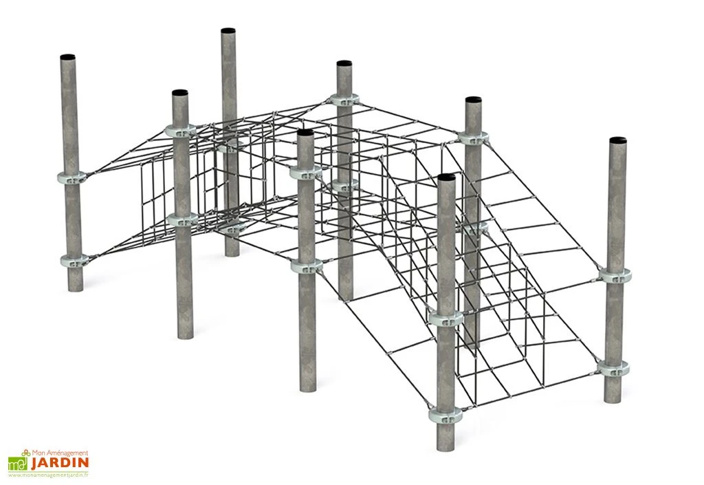 Ce jeu d’extérieur pour collectivités mesure 2,30 x 6,30 m et affiche une hauteur totale de 3,50 m. Il est composé de huit montants en acier galvanisé à chaud de 20 cm de diamètre et d’une structure en corde armée de 16 mm de diamètre, le tout relié par des connecteurs en aluminium. Ces différents matériaux sont parfaitement adaptés à la vie en extérieur et ne craindront ni la rouille, ni les intempéries.