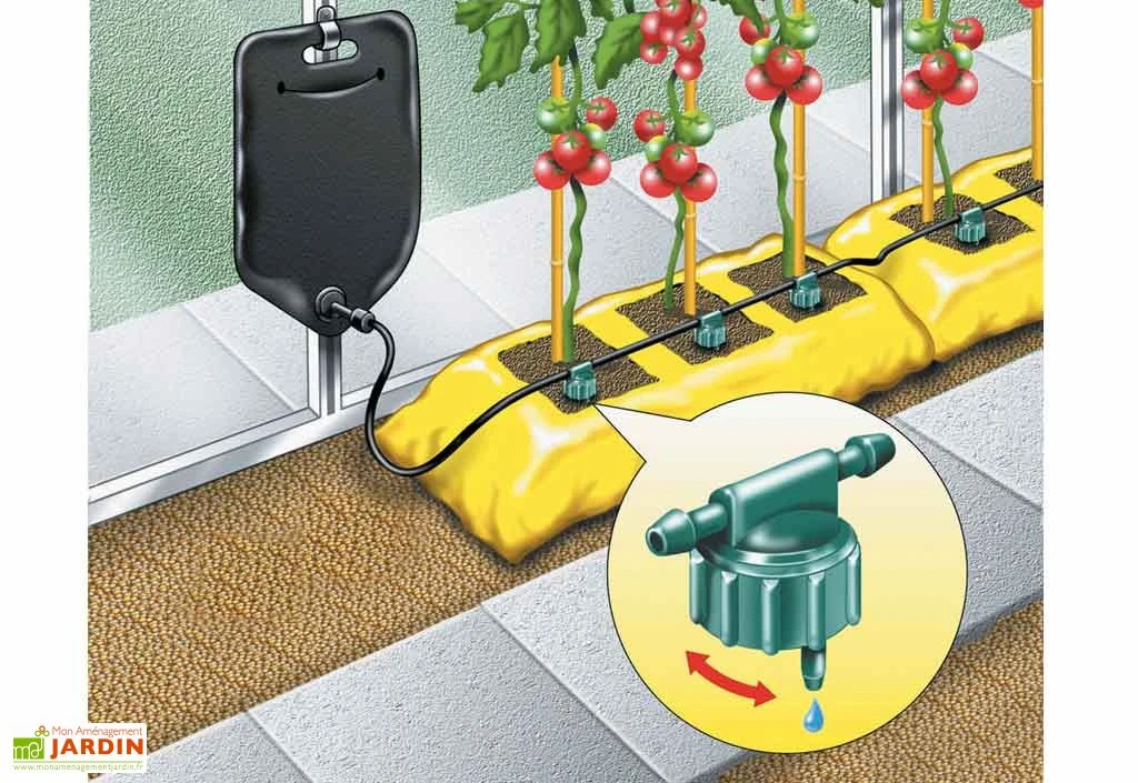 Votre kit goutte-Ă -goutte de chez ACD vous permet d’irriguer vos plantations sans avoir Ă mouiller les feuilles et risque de dĂ©velopper des maladies. Votre kit peut contenir jusqu’Ă 10,5 L d’eau pour un arrosage d’environ 24h. Chacun des 6 goutteurs peut voir son dĂ©bit rĂ©glĂ©. Le tube d’irrigation de votre kit mesure 5m de long. La garantie est de 2 ans.