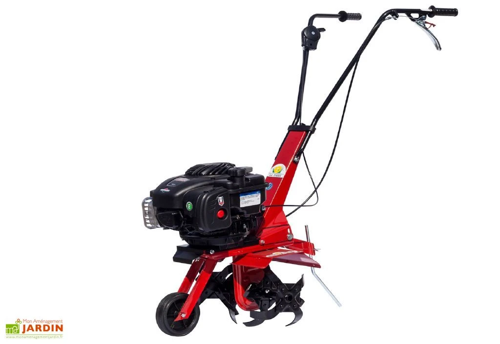 La motobineuse de chez Eurosystems est une motobineuse thermique équipée d’un moteur 4 temps Briggs & Stratton 450e series de 125 CC. Son moteur possède un démarrage manuel et une contenance de réservoir de 0,8L. La motobineuse possède 4 fraises de 25 cm de diamètre qui permettent une largeur de travail de 36 cm et une profondeur de travail de 20 cm. L’embrayage des fraises est possible grâce à un levier sur le guidon.