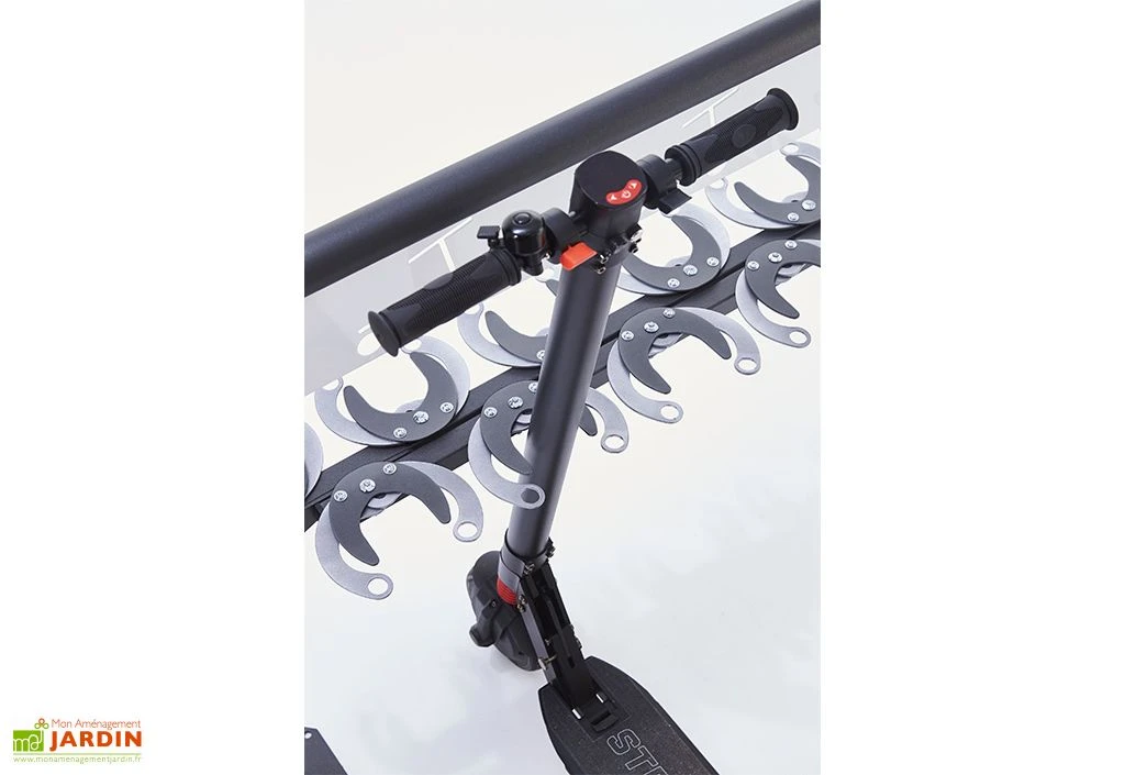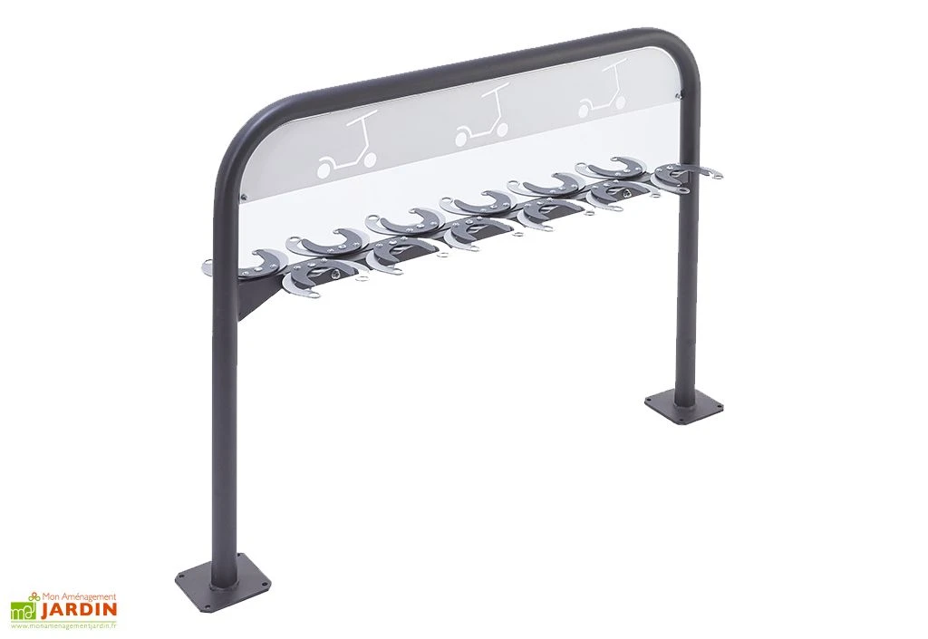 Ce range-trottinettes de la marque Mottez convient uniquement pour les collectivités. Il permettra de stationner jusqu’à 12 trottinettes à l’aide d’un système de pinces que vous pouvez bloquer par un cadenas, un câble ou un cadenas en U. Ce support offre donc un emplacement sécurisé aux utilisateurs de trottinettes et cela permet également de promouvoir les modes de déplacement écoresponsables dans votre municipalité.