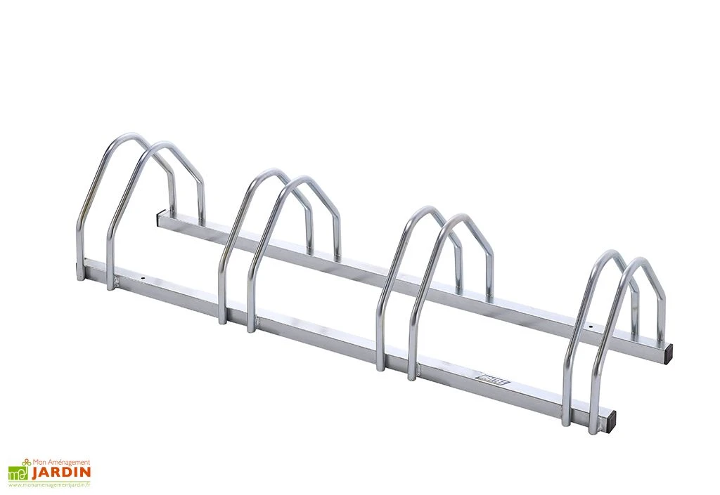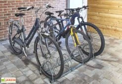 Ce range-vélos de la marque Mottez est parfait pour les collectivités. Il vous permettra de ranger jusqu’à 4 vélos aux largeurs de pneus différentes. Il dispose d’un support de 40 mm, de deux supports de 55 mm et d’un support de 70 mm. Tous les supports de pneus sont coniques permettant ainsi de mieux bloquer les roues de vos vélos. Le râtelier mesure 117 cm de longueur sur 33 cm de profondeur pour 25 cm de hauteur et pèse 7 kg.