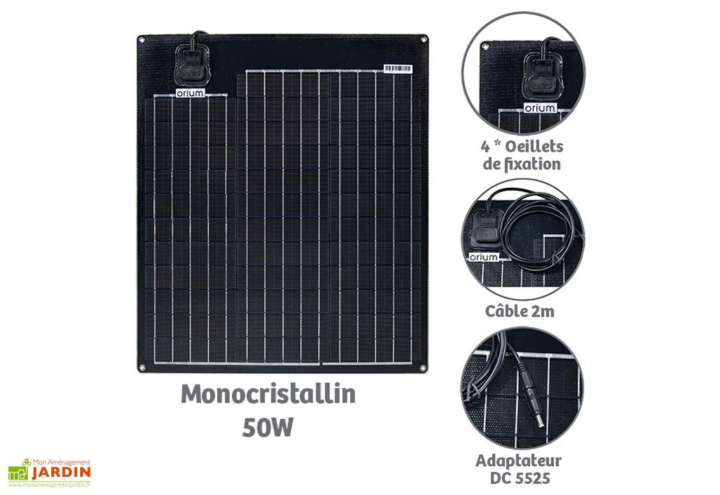 Ce panneau solaire signĂ© Orium permet de dĂ©livrer une puissance de 50 Watts et une tension de 19 V pour recharger votre batterie autonome. Il est compatible avec les modèles Izywatt 150, Izywatt 250 et Izywatt 288 d’Orium. (Il est nĂ©cessaire de disposer d’un adaptateur non inclus pour le modèle 288.)
