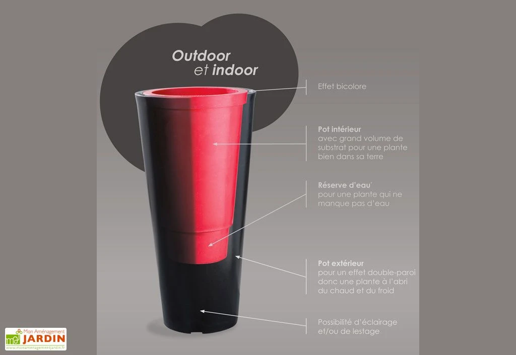 La version double paroi possède plusieurs avantages, notamment en termes de robustesse et d’isolation de vos végétaux. Composé de deux pots, le bac à fleurs possède une réserve d’eau de 4,5 L pour vos plantes. Le plus petit pot dispose également d’un double fond lui permettant de stocker l’eau et de la faire remonter dans le terreau à l’aide d’un système de mèche. Notez que le pot à double paroi pourra accueillir jusqu’à 43 L de terreau.Â