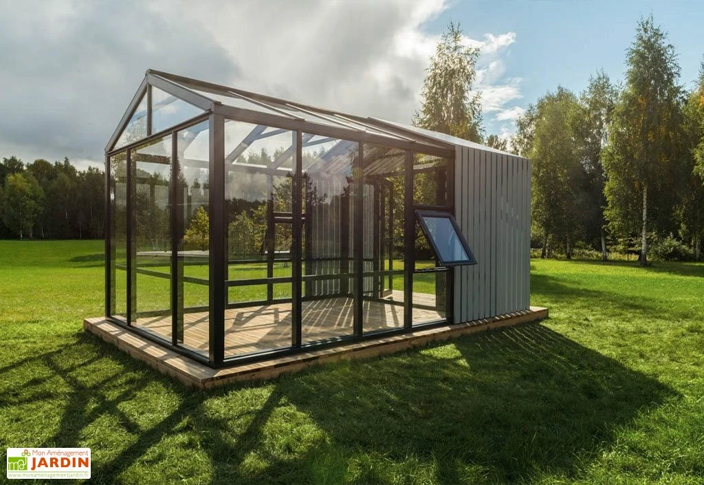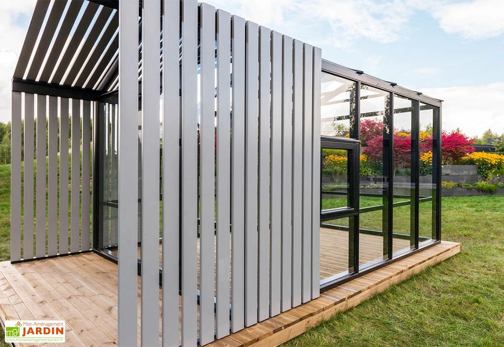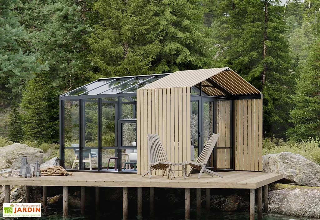 Cette serre de jardin au design original est signée Stali. Composée d’une structure en bois et de parois en verre trempé, elle est complétée par des panneaux occultants en bois, offrant intimité et ombre à l’avant de la structure.