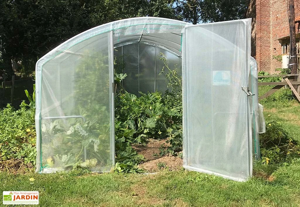 La serre de jardin en polyéthylène est équipée d’une porte pivotante de 1 m de largeur. Vous pourrez trouver une porte supplémentaire à installer à la place du pignon arrière, dans votre rubrique accessoires. Dans vos options vous avez le choix parmi une serre avec ou sans aération. Si vous choisissez la version avec aération, deux manivelles de relevage vous sont fournies, vous permettant de remonter les deux côtés de la bâche sur 70 cm.