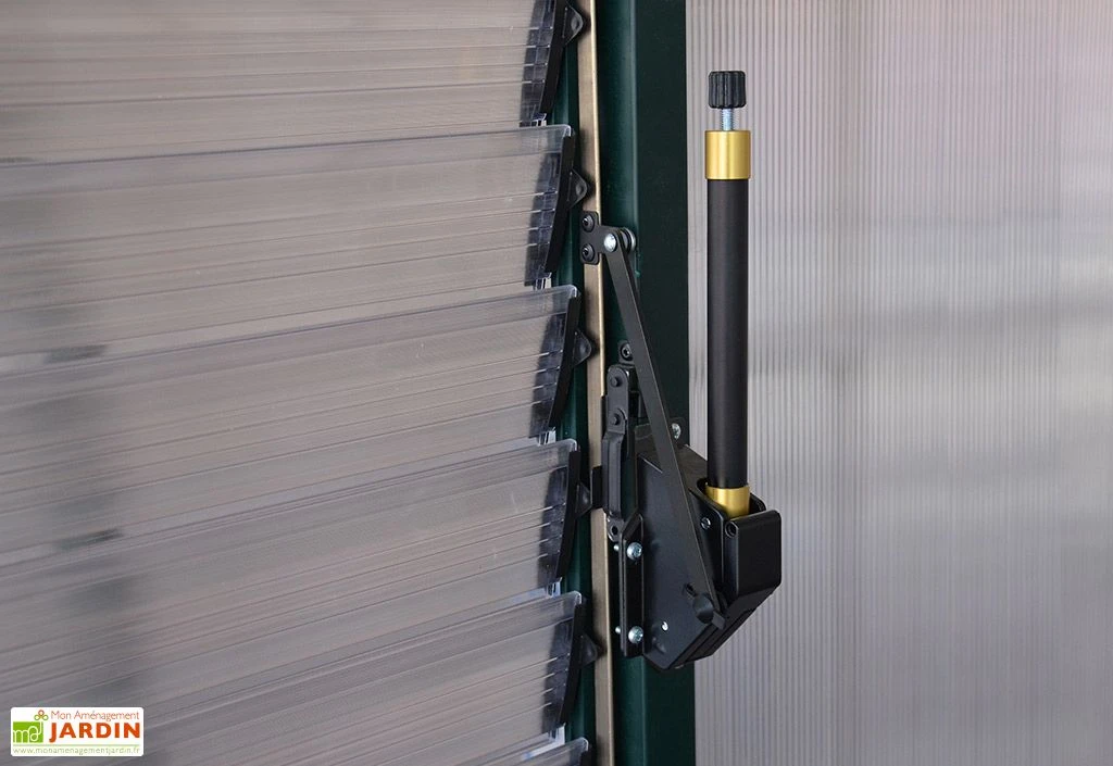 L’ouverture automatique de fenêtre s’installe sur les persiennes des serres de la marque Palram-Canopia. Elle contrôle automatiquement l’aération grâce à la cire qui se dilate sous l’effet de la chaleur. La cire pousse alors un piston qui ouvre la fenêtre graduellement et qui permet d’aérer l’intérieur de la serre. Lorsque les températures baissent la cire se contracte et un ressort vient refermer la fenêtre.