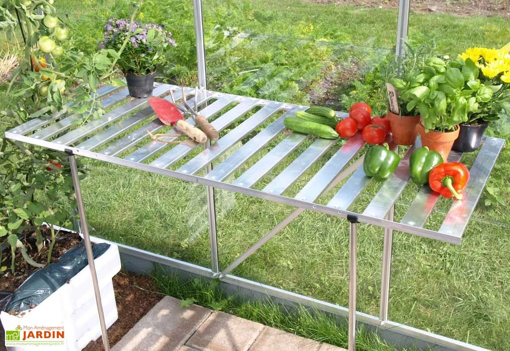 Table rabattable en aluminium laqué vert. Ne peut pas être vendue sans serre Lams.