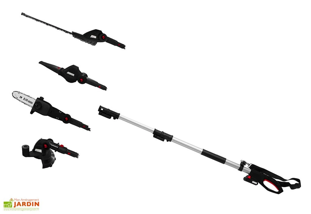 Le taille-haies sur batterie de chez Elem Garden est un outil de jardin multifonctions puisqu’il sert Ă©galement de coupe-bordures, de souffleur et d’Ă©lagueuse grâce Ă tous les Ă©lĂ©ments fournis. Cet outil de jardinage Ă©lectrique fonctionne sans fil pour vous permettre de l’utiliser en toute autonomie. Il est Ă©quipĂ© d’une batterie au Lithium 1500 mAh de 20 V qui se recharge en 4 heures. Son manche tĂ©lescopique mesure jusqu’Ă 1,60 m.Â